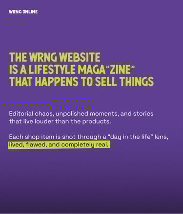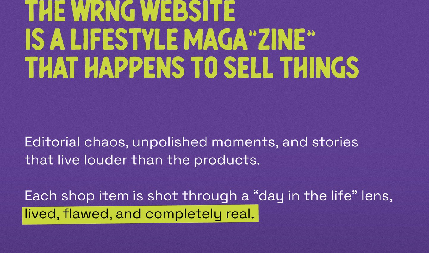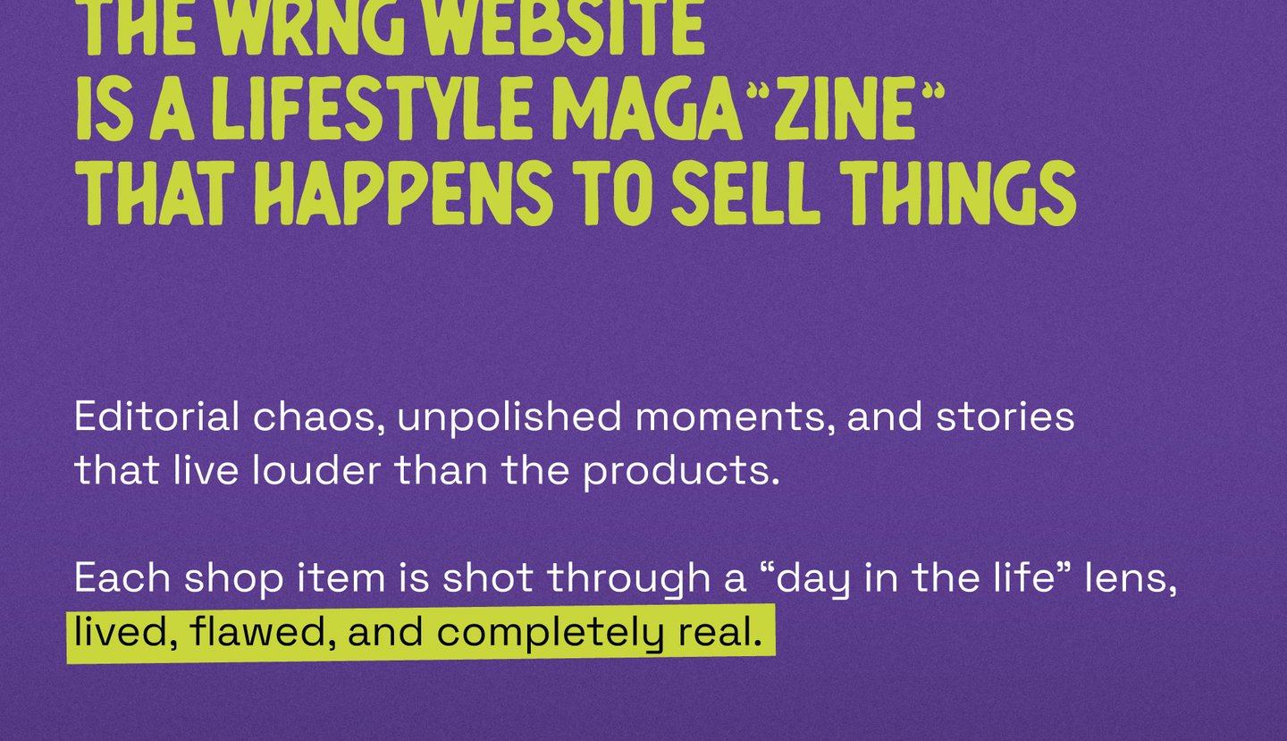 WRNG is a lifestyle brand and online shop built on flaws, celebrating imperfection as a source of confidence.